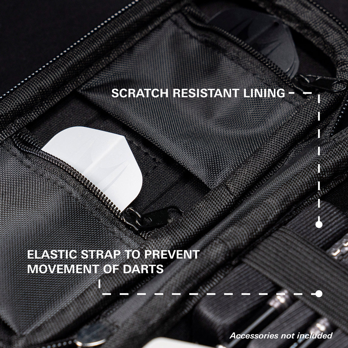 Constructed with a durable hard shell, the Takoma keeps your darts safe and protected. The scratch-resistant interior lining secures 3 fully assembled darts, while zip pockets provide space for additional accessories such as spare flights, shafts, Swiss Points, or your Swiss Point tool — combining style and practicality in one premium case.